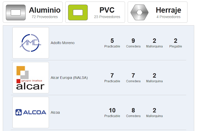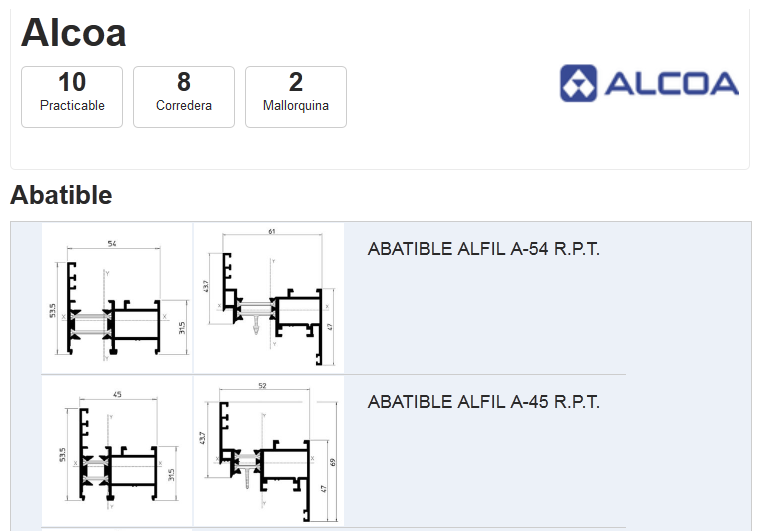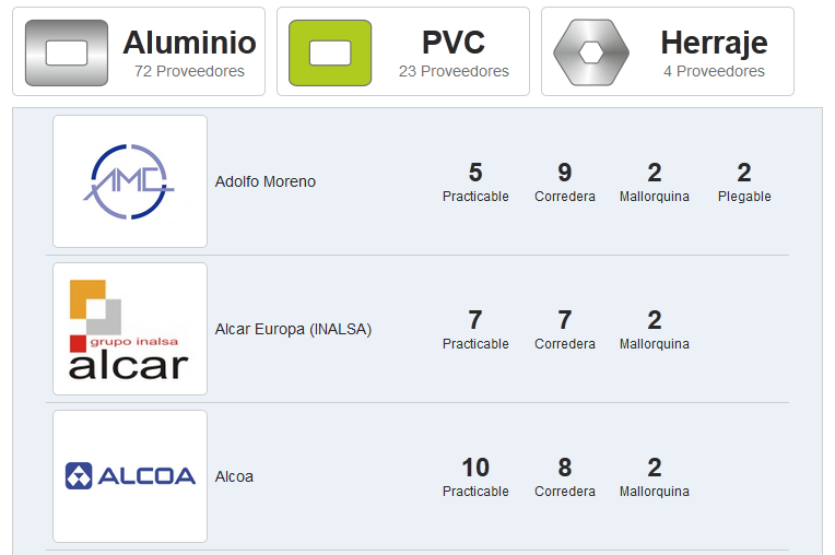 Disponemos de series de perfiles de más de 100 proveedores, incluyendo perfiles de aluminio, pvc, aluminio-madera y proveedores de herraje y accesorios.