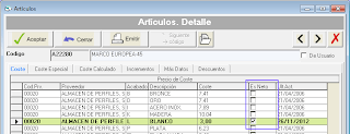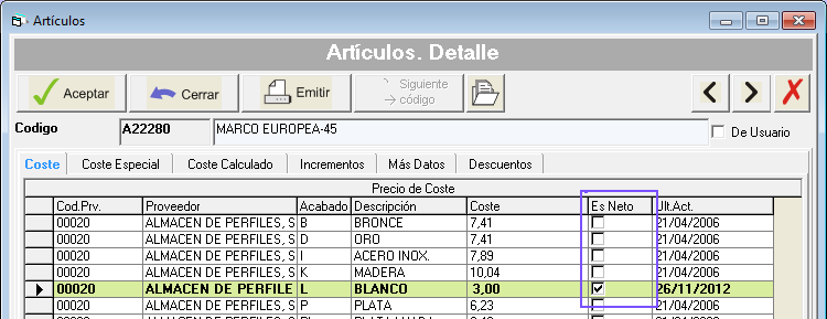 Es posible introducir un precio de coste neto directamente en la ficha del artículo sin necesidad de configurar descuentos especiales en la ficha del proveedor, simplemente marcando la casilla Coste Neto en la rejilla de precios de costes.