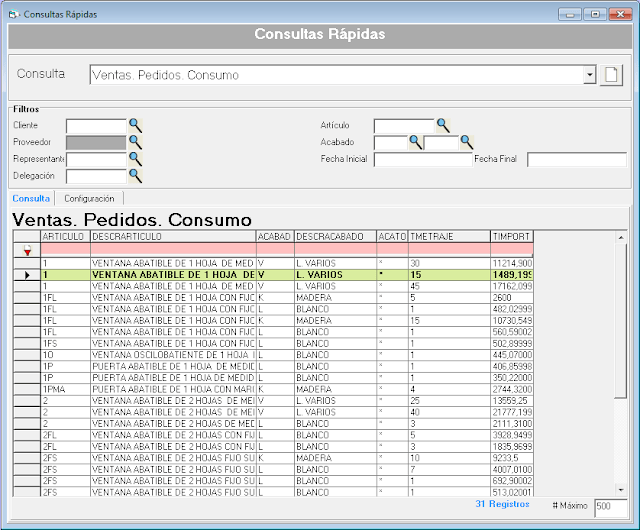 Integra consultas de consumo de ventas y compras, aunque es personalizable y el usuario puede agregar sus propias consultas de usuario para obtener cualquier información almacenada en la base de datos.