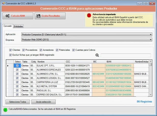 Por defecto están seleccionados todos los clientes, proveedores, acreedores, potenciales y cuentas que tengan datos bancarios en formato CCC registrados. - Haz click sobre el botón Calcular IBAN.La herramienta realiza los cálculos y los muestra en las columnas correspondientes.